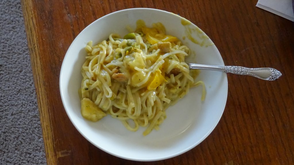 I had a bunch of extra vegetables around, and was still in a curry kind of mood today. When lunch came around I sacrificed one of my chicken breasts for a green chicken curry with rice noodles. I made it mild, stomach hasn’t been nice to me today. Fortunately I also made the breakfast curry mild too. 😛 I’ve also been living on chai today. Started the morning off with a Canadian Maple Chai, and ended the day with some Rooibos Chai. I already have breakfast curry packed up for tomorrow morning along with some grapes, crackers and peanut butter dip. That should keep me plenty fueled tomorrow morning, even the tea has caffeine. I’m Ret 2 Go.