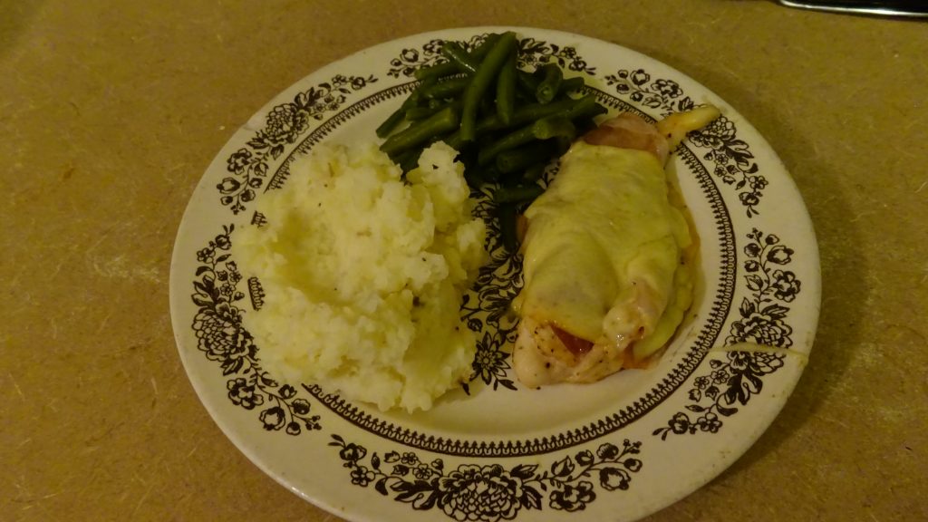 I pitched in for dinner this evening. Took a couple chicken breasts, sliced them thin, and combined them with some prosciutto and gouda. Then I ran out of gouda and prosciutto and substituted swiss and regular ham as an alternative. It kind of reminds me of Chicken Cordon Bleu. I might have to make a sauce to accompany it next time, but the addition of the ham and prosciutto and cheeses gave the chicken a nice flavor palate. I also cooked up some fresh green beans and made some buttery mashed garlic potatoes. I think we finally have enough leftovers that I won’t have to worry about food for the next few days.
