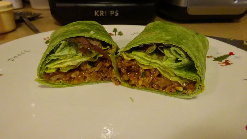 I treated myself to a beef and lettuce sandwich wrap today instead of the usual diet shake. I made a Korean inspired sauce and poured it over some cooked ground beef, a little jasmine rice and green onion, wrapped with some bibb lettuce and spinach wraps. I wanted to do something different, and not only did I achieve that, it tastes really good! I think next time I’ll chop up some tomato and cook some bell pepper or carrot along with it.